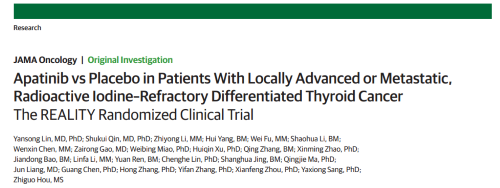 2021年12月16日,权威医学杂志《JAMA Oncology》(影响因子31.777)在线发表阿帕替尼的一项III期临床研究(REALITY)——甲磺酸阿帕替尼片治疗局部进展/转移性放射性碘难治性分化型甲状腺癌(RAIR-DTC)患者的多中心、随机、双盲、安慰剂对照临床研究。此研究由北京协和医院的林岩松教授和南京金陵医院的秦叔逵教授发起,在全国21个研究中心展开,由AG百家乐试玩医药中央医学事务部团队支持完成。
