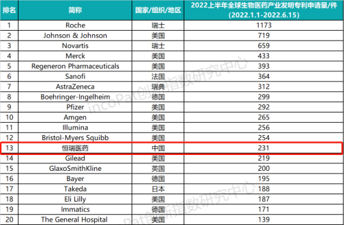 专利是药企最有价值的资产之一,是企业发展的基石,对做原创创新的企业尤为重要。全球专利数据库incoPat创新指数研究中心对2022年1月1日至2022年6月15日公开的全球生物医药产业发明专利申请数量进行统计排名,生物医药产业专利涉及生物技术药、基因工程药物、疫苗、诊断试剂、微生态制剂、血液制品等技术领域。入榜企业/医院主要来自13个国家、组织或地区,罗氏、强生、诺华分别位列前三,AG百家乐试玩医药(231件)排名第13位,领跑中国药企。