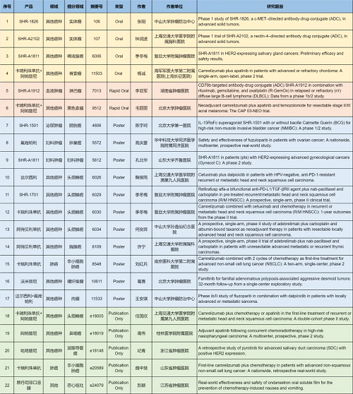 在肺癌、妇科肿瘤、淋巴瘤、膀胱癌、头颈肿瘤、黑色素瘤、肉瘤、鼻咽癌、脊索瘤、唾液腺癌、胸腺癌、硬纤维瘤、涎腺导管癌等其他多个疾病领域,卡瑞利珠单抗、阿帕替尼、阿得贝利单抗、吡咯替尼、达尔西利、氟唑帕利、法米替尼、SHR-1501、瑞拉芙普-α(SHR-1701)、SHR-1826、瑞康曲妥珠单抗(SHR-A1811)、SHR-A1912、SHR-A2102等抗肿瘤创新药相关研究一共入选了4项口头报告、2项快速口头报告、11项壁报展示和4项线上发表,彰显了AG百家乐试玩医药强劲的研发实力。此外,昂丹司琼口溶膜在防治化疗导致的恶心呕吐方面展现出了良好的疗效,本次ASCO年会有1项研究线上发表。