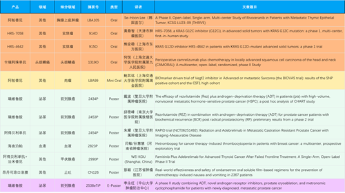 在胸腺上皮肿瘤、头颈鳞癌、肉瘤、前列腺癌、甲状腺癌等其他多个疾病领域,卡瑞利珠单抗、阿帕替尼、瑞维鲁胺、阿得贝利单抗、法米替尼、HRS-7058、HRS-4642等抗肿瘤创新药相关研究一共入选了4项口头报告、1项简短口头报告、4项壁报、1项电子壁报,彰显了AG百家乐试玩医药强大的研发实力。此外,海曲泊帕和昂丹司琼口溶膜分别在防治化疗导致的血小板减少和恶心呕吐方面各有1项研究入选壁报。